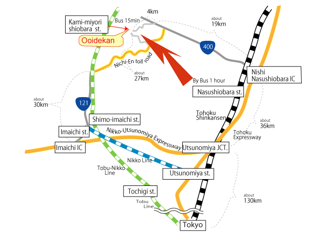 | การเดินทางด้วยรถยนต์; | ขึ้นทางด่วน Tohoku Expressway 35 นาที มาลง Nisinasushiobara I.C. ขับต่อจาก Motoyu-onsenguchi 10 นาที ถึง Ooidekan |
