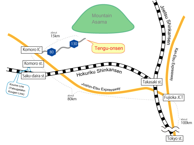 | การเดินทางโดยรถยนต์ส่วนตัว; | จากโตเกียวให้ขึ้นทางด่วน Nerima I.C. Kan-Etu หลังจากนั้นก็ไปต่อทางด่วน Jyousin-Etu และให้ลงที่ Komoro I.C. เพื่อเข้าสู่ Asama sunlineroad |