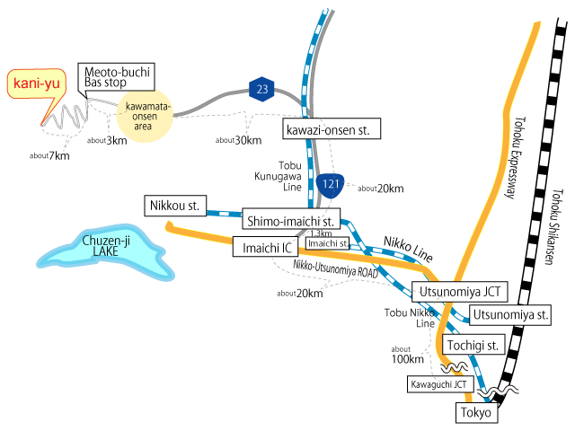 | โดยรถยนต์; | เริ่มต้นจากโตเกียวให้ขึ้นทางด่วนโตโฮกุแล้วเปลี่ยนไปทางยกระดับนิกโกะยูสึโนมินะ ลงป้ายอิมาชิ เกาะถนนสาย 121 และ 152 มุ่งหน้าสู่คาวามาตะ ระยะทาง 35 กิโลเมตร ใช้เวลาเดินทางประมาณ 3 ชั่วโมงครึ่ง |