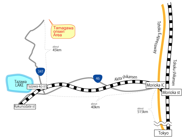| การเดินทาง; | ขึ้นรถไฟอากิตะชินคันเซ็นจากโตเกียวสู่สถานีทะเลสาบทาซาวะ หลังจากนั้นขึ้นรถประจำทางหรือแท็กซี่ 43k ไปที่บ่อน้ำพุร้อนทามากาว่า |