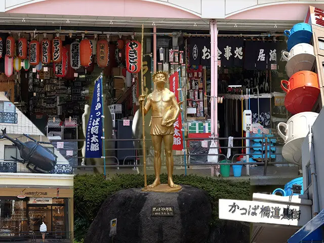 คุณยังสังเกตเห็นตัวเลข Kappa ทั่วพื้นที่ Kappabashi ทำไมถึงเรียกว่าคัปปาบาชิมีเรื่องเล่า ก่อน 180 ปี การระบายน้ำของพื้นที่ไม่ดีและทำให้เกิดน้ำท่วมหลายครั้ง เมื่อเห็นภัยพิบัติ ชายชื่อ Taro Kappagawa ไม่ชอบมันและเสนอเงินของเขาเพื่อส่งเสริมการก่อสร้างเพื่อป้องกันน้ำท่วม มีข่าวลือว่าพ่อค้ารายหนึ่งเห็น Kappa (สิ่งมีชีวิตที่เชื่อว่าอาศัยอยู่ในน้ำมีจานรองเหมือนรูปร่างบน หัวหน้า) ในพื้นที่คัปปาบาชิ และธุรกิจมากมายก็ตามมา จากนั้นพ่อค้ารายนี้ก็เจริญรุ่งเรืองมากหลังจากนั้น หลังจากเรื่องนี้ พื้นที่คัปปาบาชิกลายเป็นเมกกะของพ่อค้าชาวโตเกียวและเป็นสถานที่ล่าสัตว์สำหรับมืออาชีพและพ่อค้า คุณช่วยถือโอกาสสำรวจพื้นที่คัปปาบาชิดูหน่อยได้ไหม หากคุณรู้สึกไม่สบายและเบื่อที่จะมองหาของที่ระลึกแบบญี่ปุ่นทั่วไป และมองหาของที่ระลึกที่มีเอกลักษณ์เฉพาะตัวที่ฝังรากลึกในบริเวณนี้ดีกว่าไหม